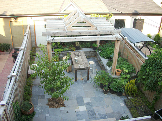 Client’s desire for an intimate outdoor dining area resulted in a ground-level stone terrace surrounded by stone planter walls which accentuate the privacy of the space. This provides additional seating and year-round visual interest from the back of the house. The rustic reclaimed wood pergola not only provides a sense of shelter from the sun, but also serves as the main sculptural focal point of the garden.